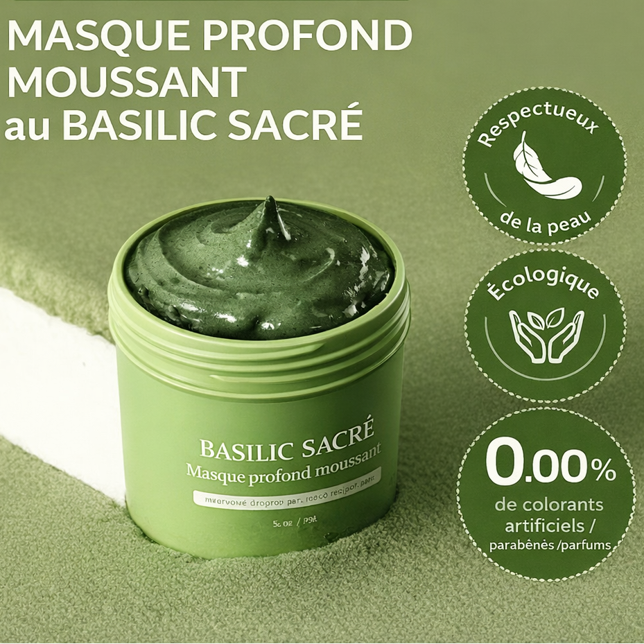 Notre Masque Moussant au Basilic utilise des extraits de basilic sacré, connu pour ses propriétés purifiantes et apaisantes. Sa formule moussante sans colorants ni parabènes offre une expérience de soin luxueuse et respectueuse de votre peau, pour des résultats visibles et durables.